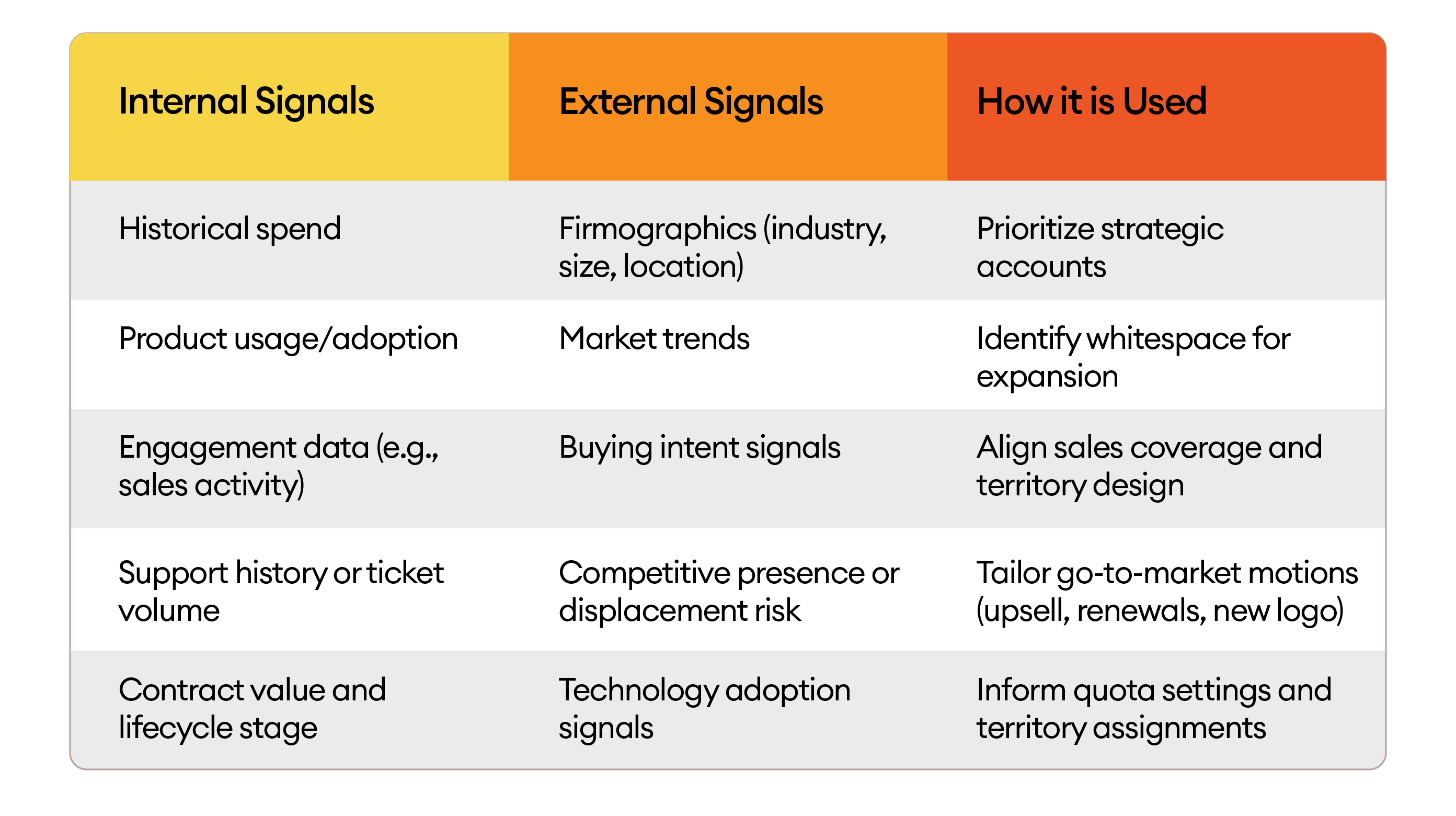 To accurately assess account potential and assign territories that reflect genuine opportunity, a combination of internal and external market data is essential. Here is a breakdown of the types of signals to incorporate — and how they help shape more informed decision-making: