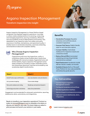 Download factsheetDigitally transform your inspection operations with Argano Inspection Management; a Power Platform accelerator for planning, conducting, and managing inspections. Standardize processes, empower field teams with mobile apps, and gain real-time visibility into compliance and results. Rapidly deploy a scalable, secure solution tailored for safety, quality, facilities, maintenance, and operational audits.