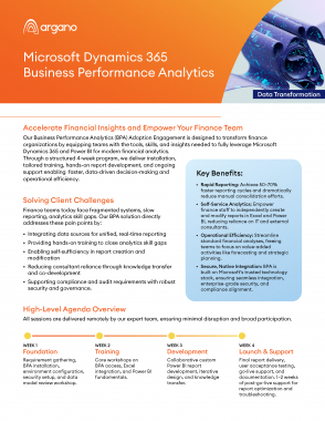 Transform your finance organization with Argano’s Business Performance Analytics (BPA) Adoption Engagement for Microsoft Dynamics 365. Our structured 4-week program empowers finance teams to achieve rapid, data-driven decision-making and operational efficiency. Benefit from seamless integration, enterprise-grade security, and hands-on training in Excel and Power BI. Unlock faster reporting cycles, self-service analytics, and reduced reliance on IT and consultants. Experience a tailored deployment, collaborative report development, and ongoing support enabling your team to focus on strategic planning and forecasting.